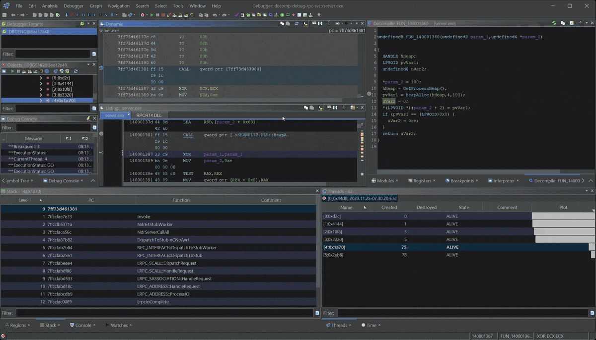 - Dynamically Debugging a Windows RPC Server: Gain insight into Windows RPC and apply dynamic inspection using Ghidra’s Debugger.