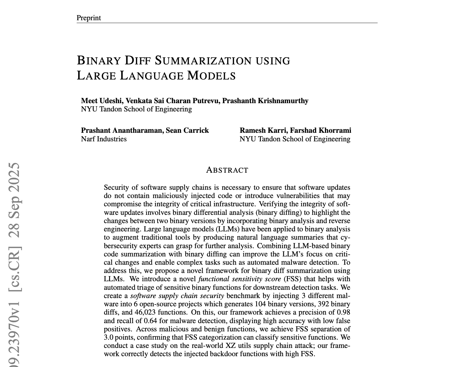 The paper highlights how ghidriff, our open-source Ghidra-based diffing tool, can serve as the foundation for next-generation vulnerability analysis pipelines. By combining binary diffing with LLM summarization, the authors demonstrate a powerful framework for software supply chain security.